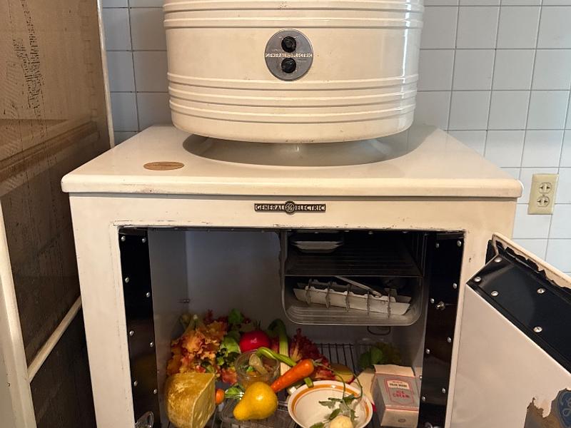 An iconic, early electric refrigerator with a distinctive, battleship-like cooling unit perched on top.