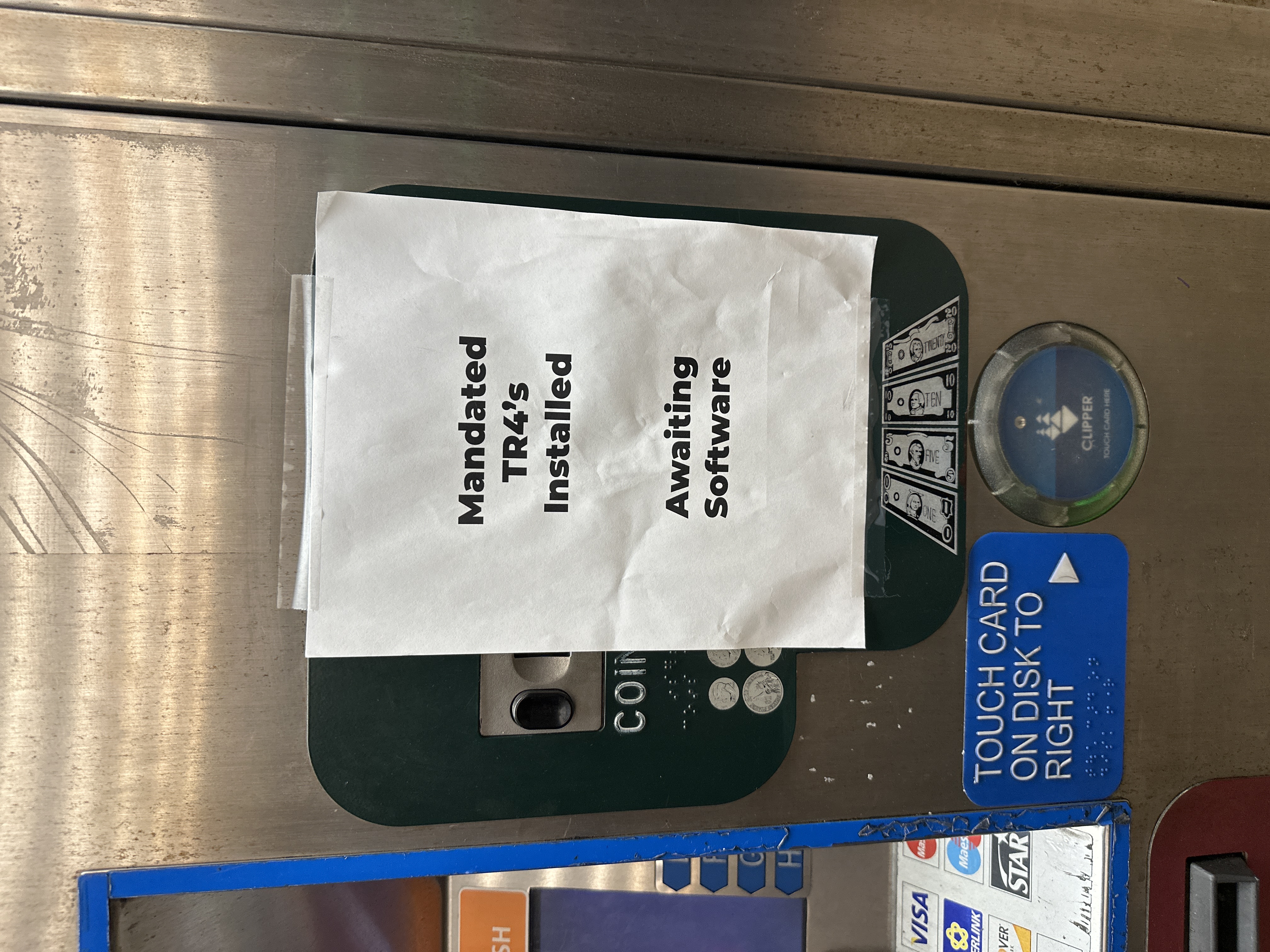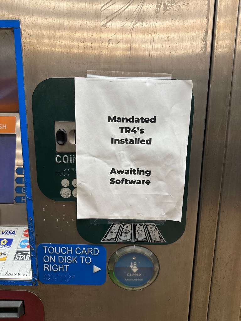 The sign states "Mandated TR4's Installed, Awaiting Software." This isn't just a quirky maintenance note; it refers to a significant upgrade to BART's fare collection system. "TR4" stands for "Ticket Reader 4," which are the fourth generation of fare gates, or the internal components within them, designed to be quicker, more reliable, and capable of processing a wider range of payment methods. The term "mandated" indicates that these installations are either required by a higher authority, perhaps a state regulation for public transit efficiency or accessibility, or are part of a larger, system-wide initiative by BART.