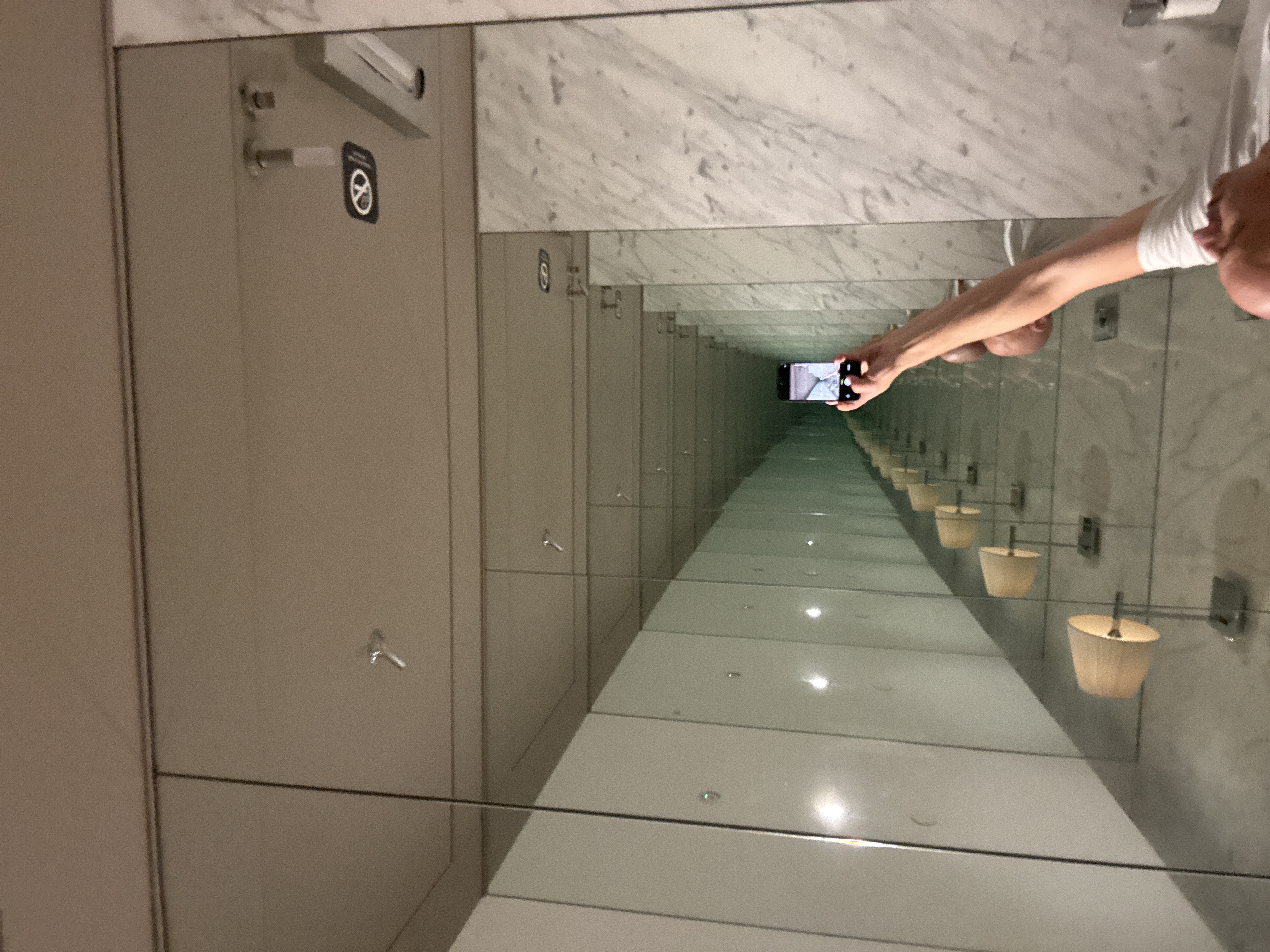 This seemingly simple mirrored wall creates a visually intriguing "infinity room" effect, a common architectural trick that uses opposing reflective surfaces to create the illusion of an endlessly receding space. While often used in art installations or themed attractions, finding such a pronounced example in an everyday space like an airport terminal restroom can be quite unexpected and amusing. It transformed what would otherwise be a mundane washroom into a momentary optical illusion.