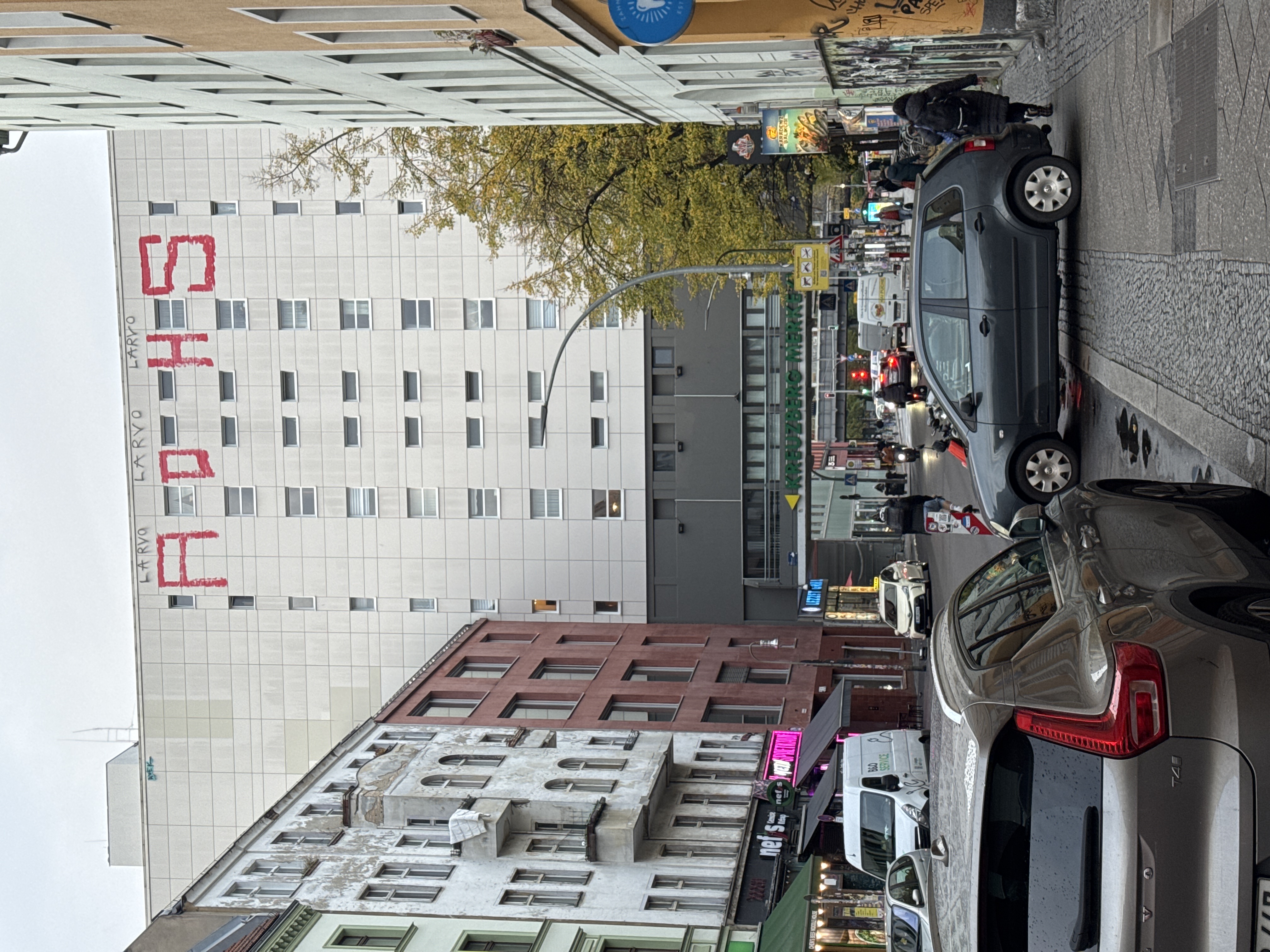 While the graffiti makes a statement, the street-level activity reflects the bustling everyday life of a vibrant urban area. You can see various shops and businesses, including what appears to be a Turkish bakery on the left (Gaziantep Kılıçoğlu Baklavaci). This area of Berlin, particularly Kreuzberg, is known for its strong Turkish community and diverse culinary scene, with many shops and restaurants offering authentic Turkish goods and food. The pedestrian and vehicle traffic, along with the overhead train bridge in the background (likely part of Berlin's elevated U-Bahn or S-Bahn network), further emphasize the dynamic, interconnected nature of this European metropolis.