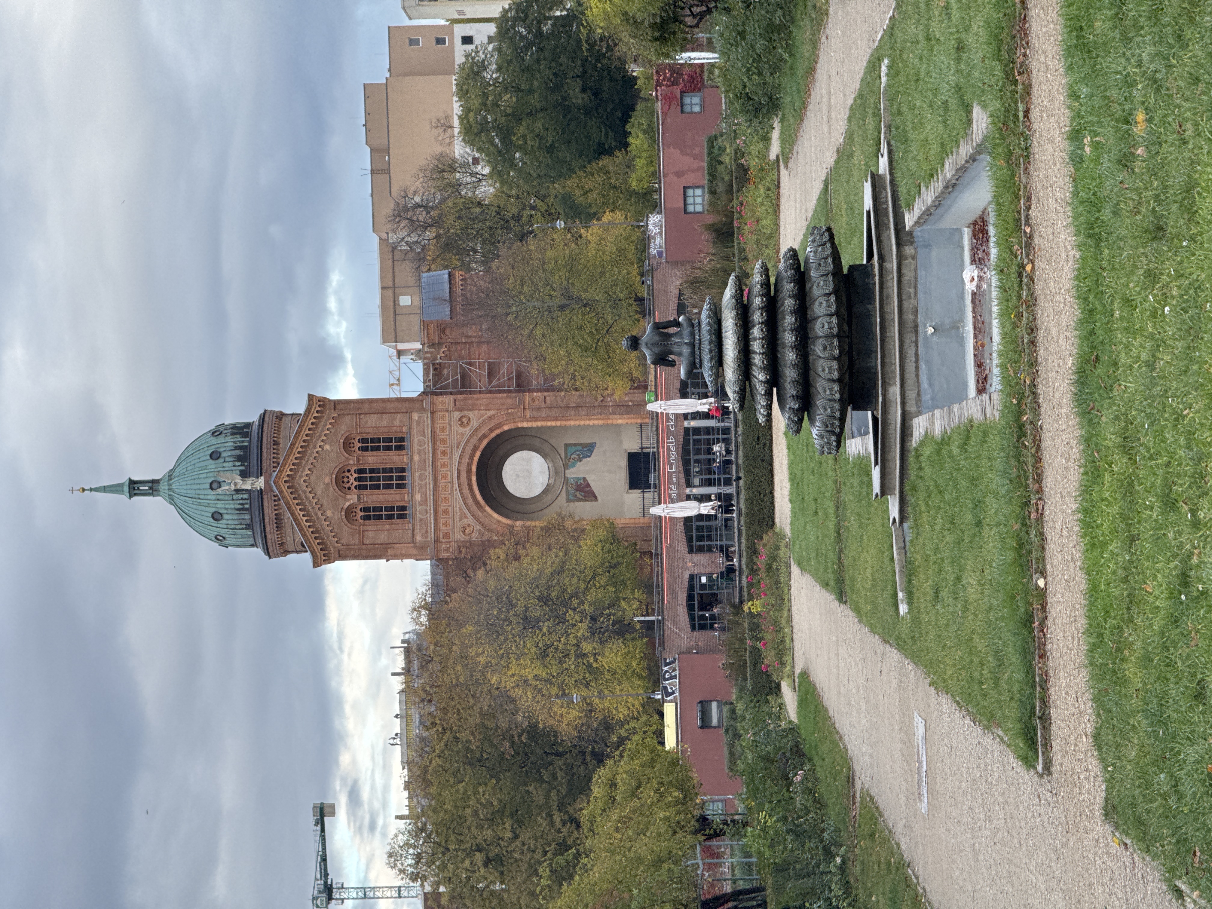 Behind the statue and the church, you can just make out a cafe with the German sign "Café am Engelbecken." This translates to "Cafe at the Angel Basin," referring to the picturesque pond and green space known as the Engelbecken, which means "Angel Basin" or "Angel's Pool." This basin, originally a part of the Luisenstädtischer Kanal that connected the Spree and Landwehr Canal, was turned into a park after the canal was filled in during the early 20th century. Today, it offers a peaceful urban oasis, and the cafe provides a pleasant spot to enjoy the view of both the church and the park.