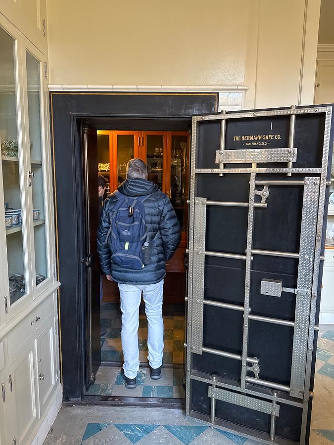 What you're seeing here isn't just an ordinary door, but a custom-built vault door from the Hermann Safe Company of San Francisco. Found in what was once a grand estate, this heavy, reinforced entry suggests that the room beyond was designed for serious security.