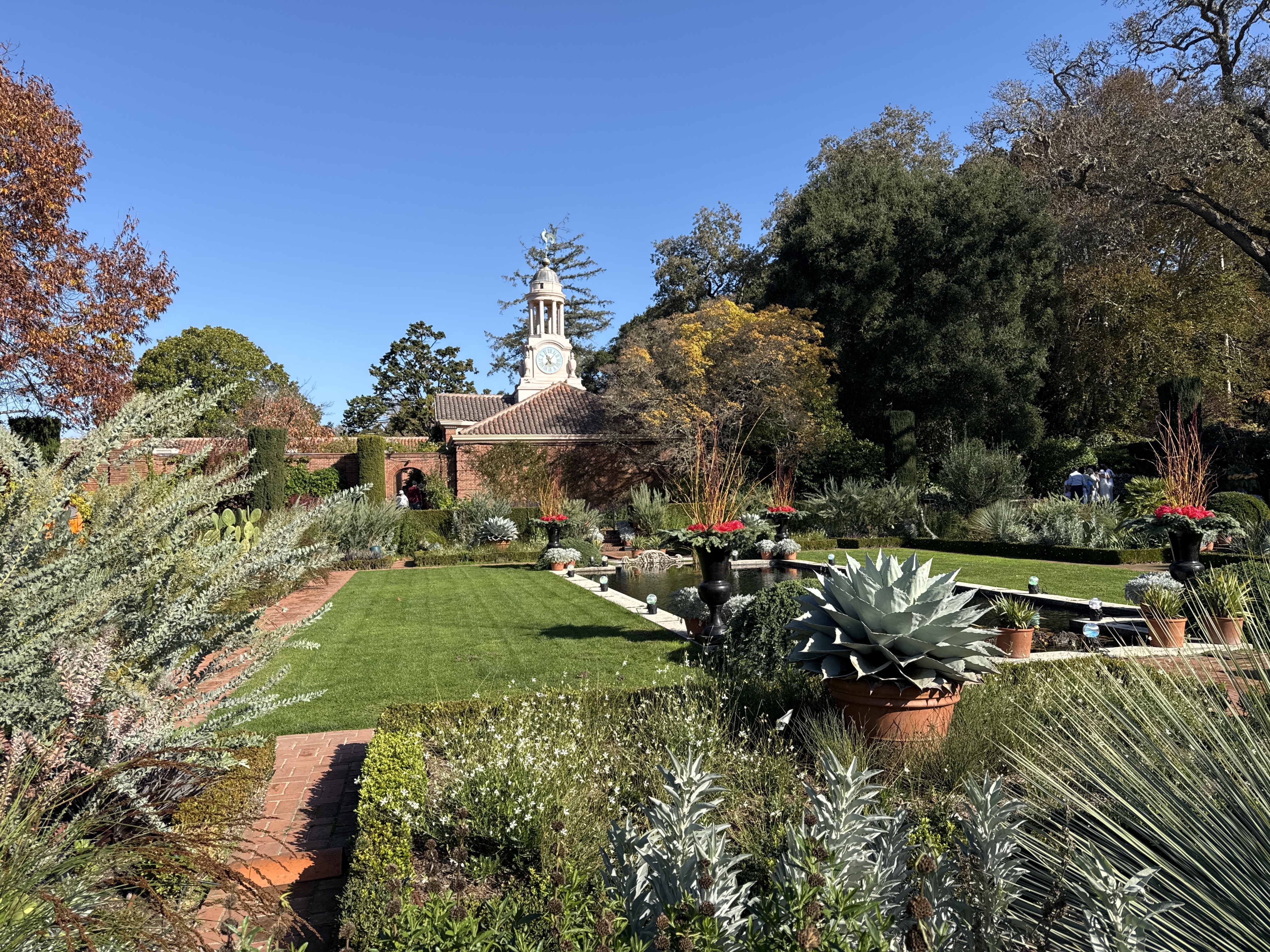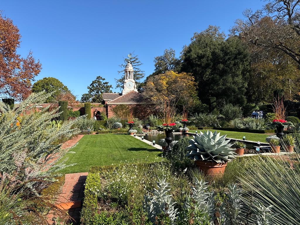 The estate is renowned for its magnificent formal gardens, which you can see a glimpse of here with their meticulously manicured lawns, brick pathways, and diverse plantings, including mature trees and potted succulents. These gardens are designed in a classic European style, reminiscent of Renaissance and Baroque gardens, and are divided into many distinct "rooms," each with its own character and purpose. Many of the features, like the ornamental urns and reflecting pools, are designed to create a sense of grandeur and tranquility. Today, Filoli is a National Trust for Historic Preservation site, open to the public, offering a fascinating window into early 20th-century California estate life and horticultural excellence.