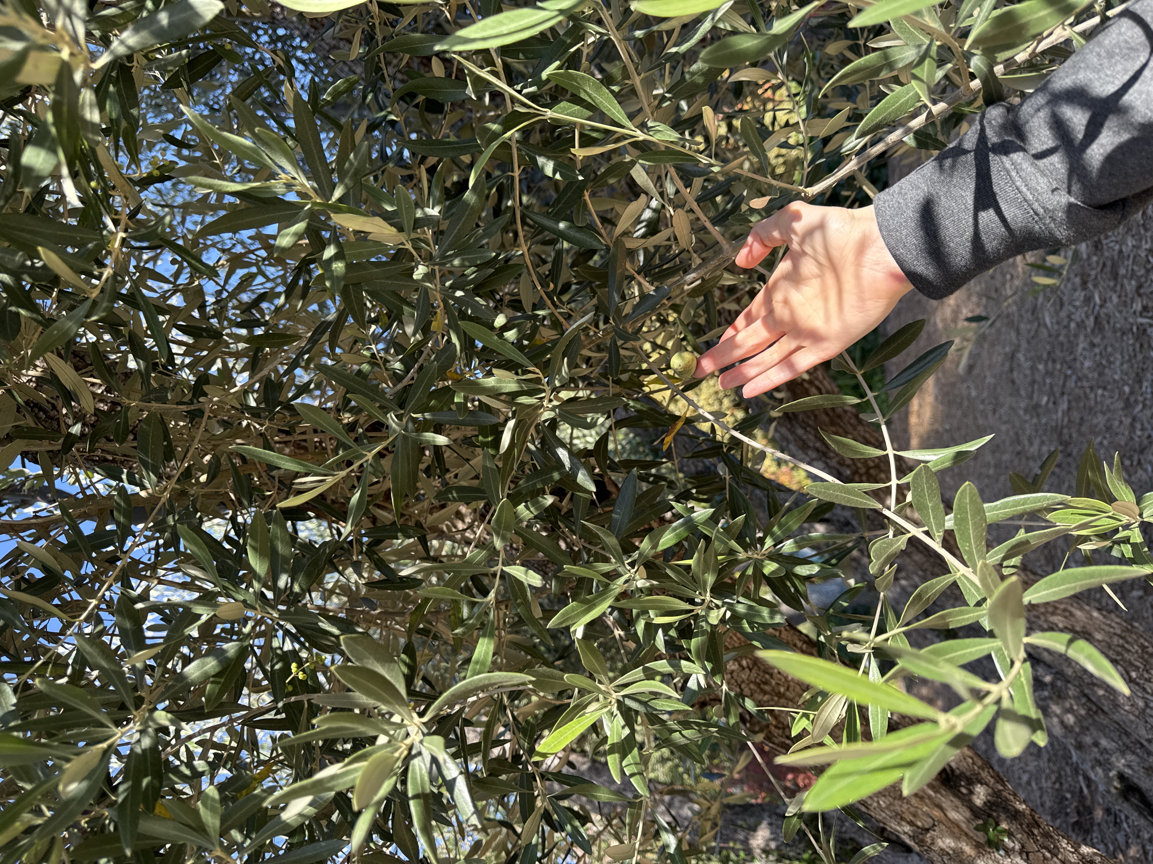Despite olive oil being a staple in many kitchens in Europe and North America, many people have never actually seen an olive tree, let alone an olive still on the branch. This is an olive tree, easily recognizable by its narrow, silvery-green leaves, and the small, oval fruit, which is currently still young and green.