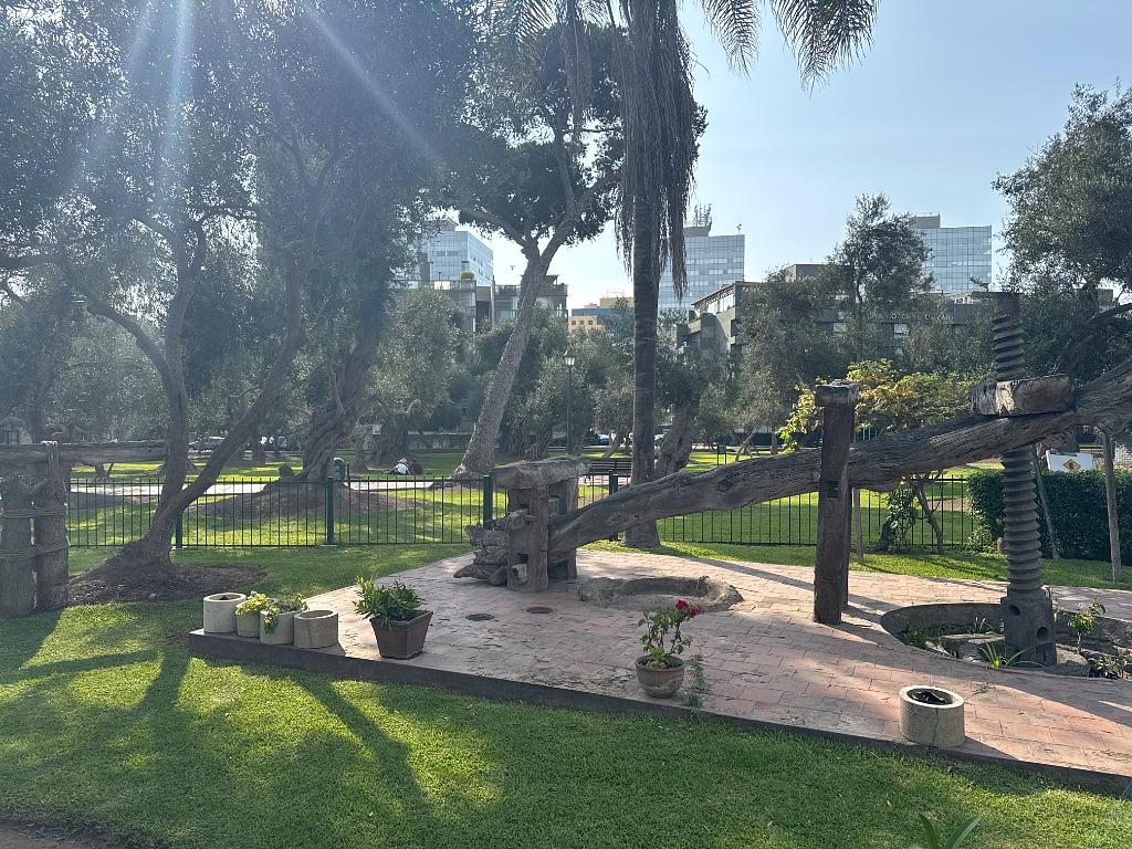 You've captured part of El Olivar Park in San Isidro, Lima, a unique urban olive grove steeped in history. The prominent wooden structure is a replica or an original piece of an olive press, representing the park's origins. These olive trees were planted in 1560 by Antonio Rodriguez, a Spanish conqueror, making them some of the oldest cultivated trees in South America. The park was originally part of a larger hacienda and provided olive oil for colonial Lima. Today, it's a protected national monument.