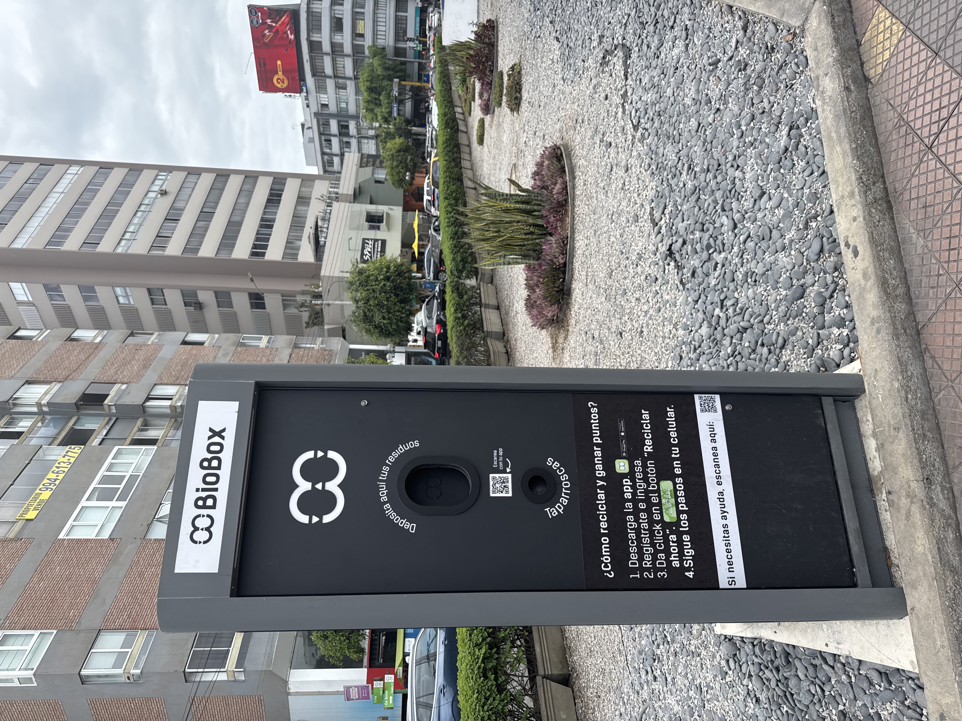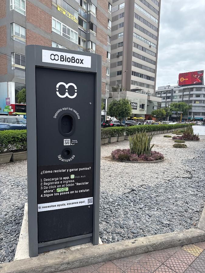 This BioBox is a smart recycling station where users can deposit plastic bottle caps and earn points through an associated app. These types of stations are appearing in various cities globally, often as part of initiatives to promote recycling and circular economy principles, sometimes with incentives like discounts or donations to social causes. The specific mention of "taparroscas" (bottle caps) and the "BioBox" branding suggest a focused recycling program, likely collecting a specific type of plastic for repurposing or advanced recycling.