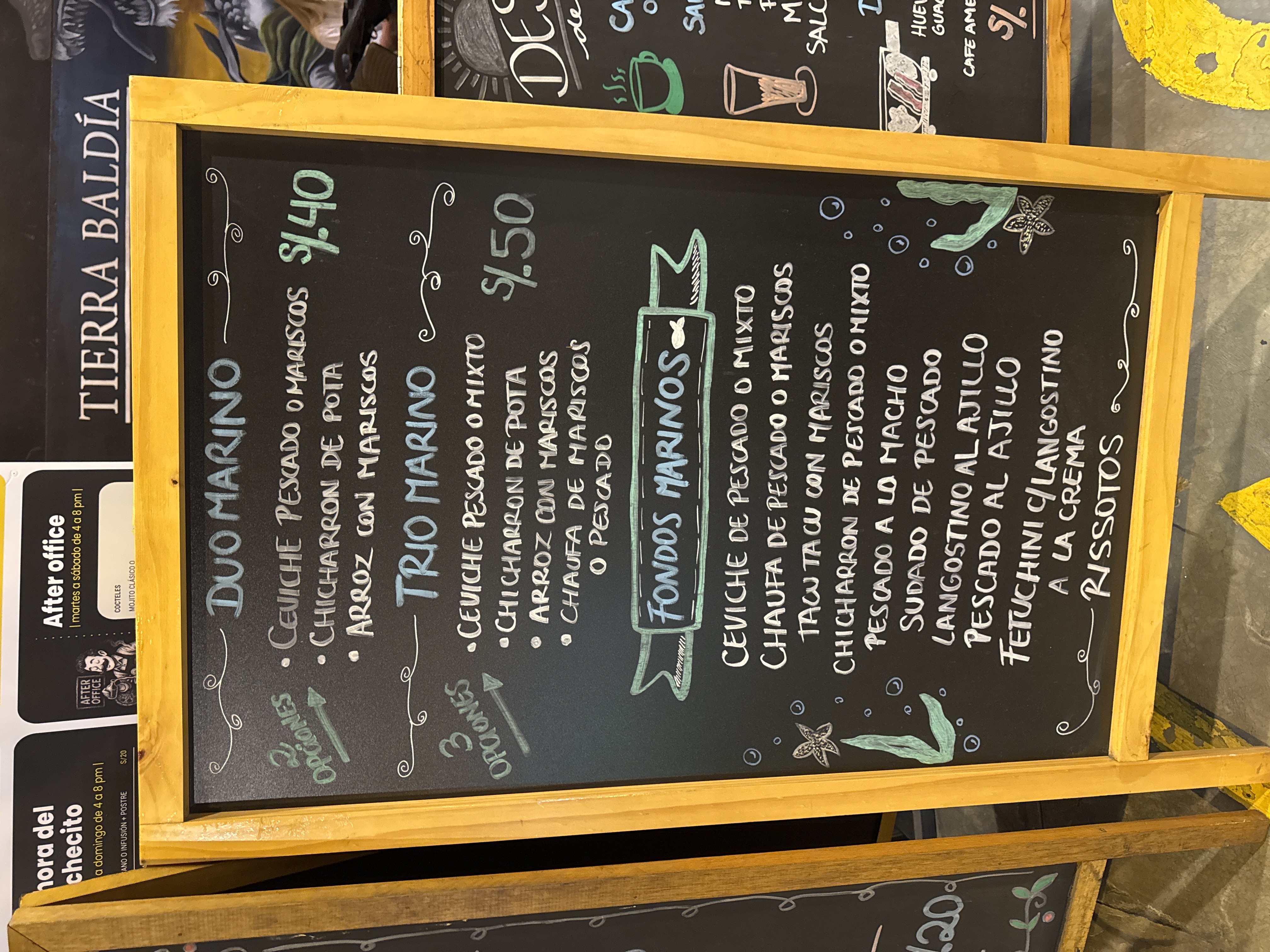 The blackboard in front of you is a vibrant display of Peruvian culinary offerings, specifically highlighting seafood dishes. This kind of menu board is a common sight in restaurants and smaller eateries across Peru, designed to attract passersby with daily specials or popular items.
