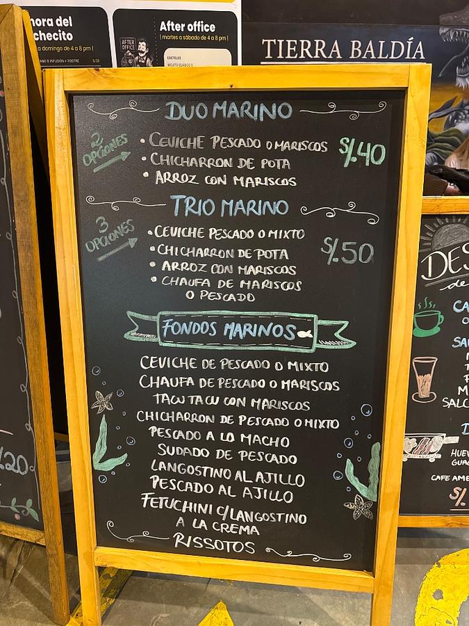 This blackboard menu from Peru showcases popular seafood dishes. *Duo Marino* and *Trío Marino* are combinations featuring ceviche, *chicharrón de pota*, and *arroz con mariscos*. *Ceviche* is a classic Latin American dish of raw seafood marinated in citrus juices, typically lime, and spiced with ají. *Chicharrónes* are usually fried pork belly, but here *chicharrón de pota* refers to fried Humboldt squid, a common, affordable seafood in Peru. *Arroz con mariscos* is a vibrant seafood rice dish, similar to paella.