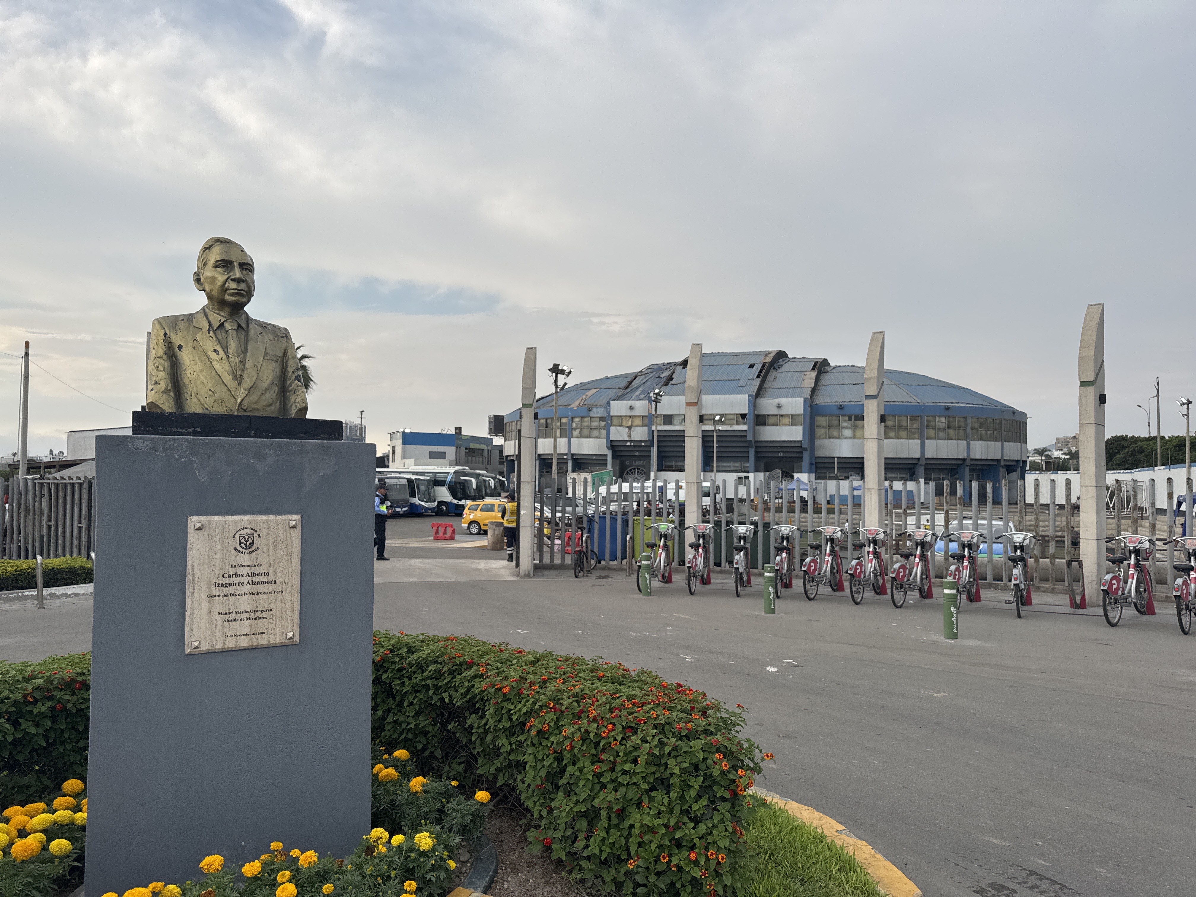 The bust depicts Carlos Alberto Izaguirre Alzamora, a prominent figure in Peruvian sports. Known as "El Viejo" (The Old Man), he was instrumental in developing sports infrastructure and administration in Peru. The plaque mentions his role as the founder of the National Sports Institute (IPD) and his contribution to the construction of Miguel Grau Stadium in Callao, which is likely the large, circular building visible in the background. This stadium, originally completed in 1966, was crucial for various sports events, particularly football, and has hosted important matches throughout its history. Across the street from the stadium, you'll see "Ciclovía Malecón de la Marina," a dedicated bike path along the coast, offering scenic views and a popular spot for cycling and recreation in Lima.