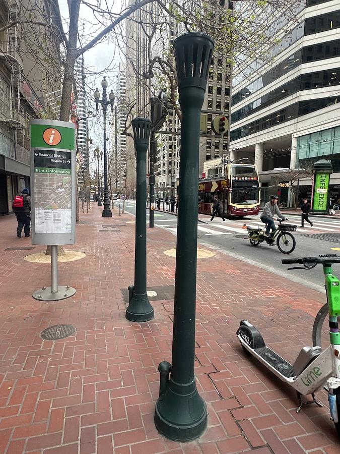 More precisely, these distinctive lamp post-like structures are often subtle exhaust vents for the Bay Area Rapid Transit, or BART, system. Given this location in the Financial District, it's highly likely these are connected to the deep tunnels that carry BART trains beneath the city. As trains move through these subterranean passages, they create considerable air pressure, and these vents allow that pressure to equalize at the surface, preventing uncomfortable air surges for passengers and maintaining air quality in the tunnels. While they may not light up like traditional lamps, their carefully designed tops with slats allow air to flow out effectively.