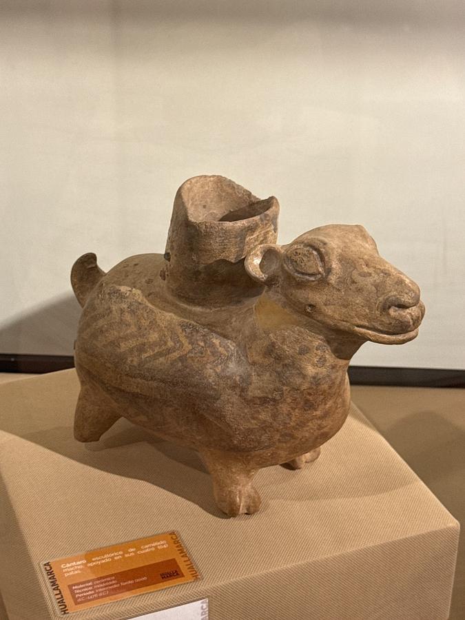 This ceramic **cántaro escultórico** (sculptural pitcher) from the **Lima culture** is a funerary offering, likely dating from 200-600 AD. Lima culture pottery often features interlocking geometric patterns in red, white, and black. This design, with the vessel on the back of an animal, was common for ritualistic purposes, often containing offerings for the deceased. Such vessels are typical finds in burial sites and **huacas** (ancient ceremonial centers) around Lima.