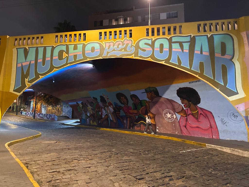 This is the Bajada de Baños in Barranco, Lima. The bridge features striking street art. The text "MUCHO por SOÑAR" translates to "MUCH to DREAM about." The mural beneath it depicts a vibrant scene, common in Barranco, known for its bohemian atmosphere, art, and nightlife. This area connects the district's main square to the sea, originally built for bathers.