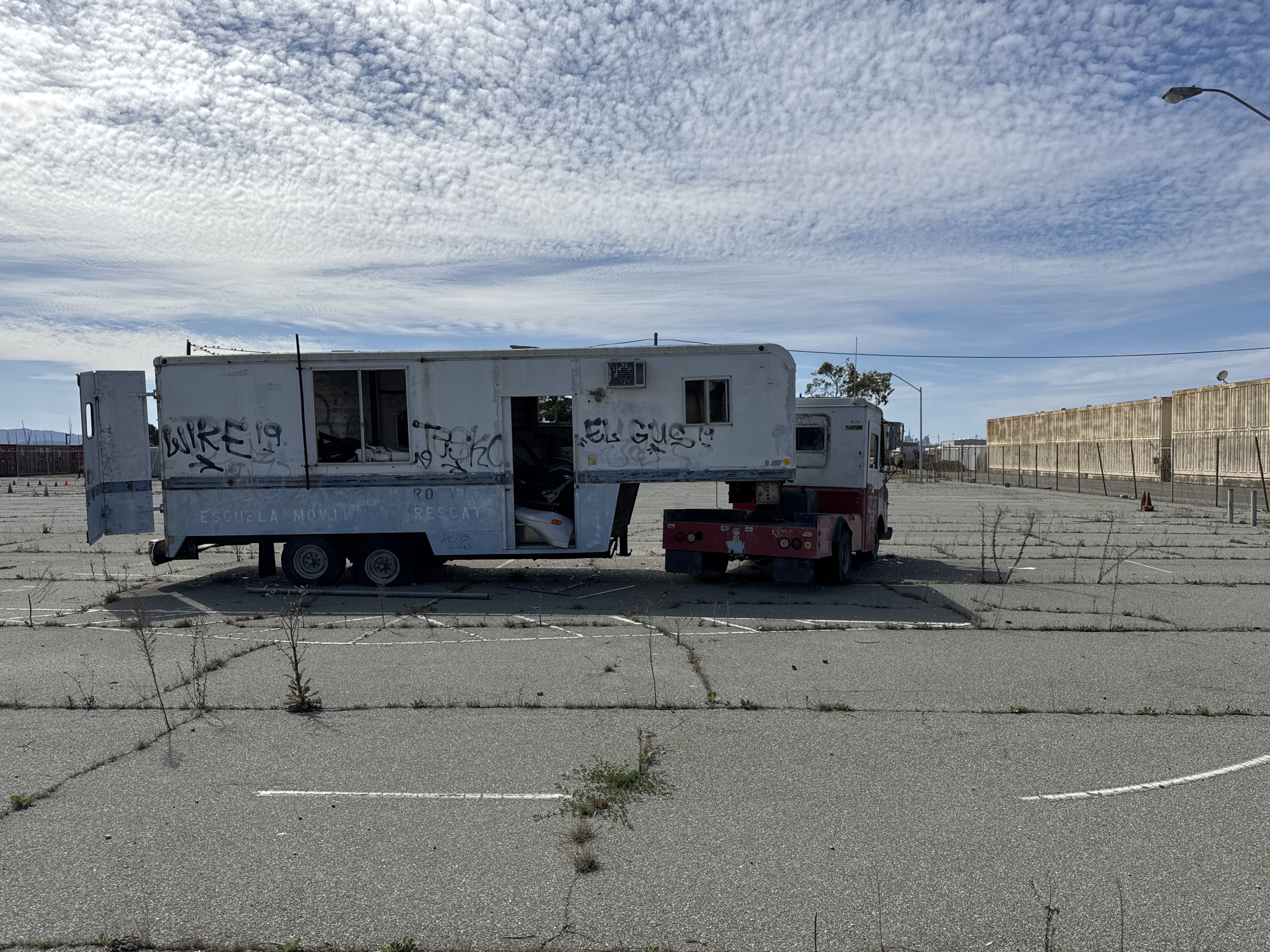 The trailer features the Spanish text **"Escuela Movil"** (Mobile School), suggesting it was once repurposed as a mobile classroom or community outreach unit before being abandoned here. Its current state—vandalized with graffiti—reflects the complex transition of the Alameda Point area, which struggles between high-end redevelopment and its identity as an industrial wasteland favored by urban explorers and street artists. The location is also adjacent to the Alameda Point "Enterprise Zone," where the lack of active surveillance allows such relics to remain for years as unintended monuments to urban decay.