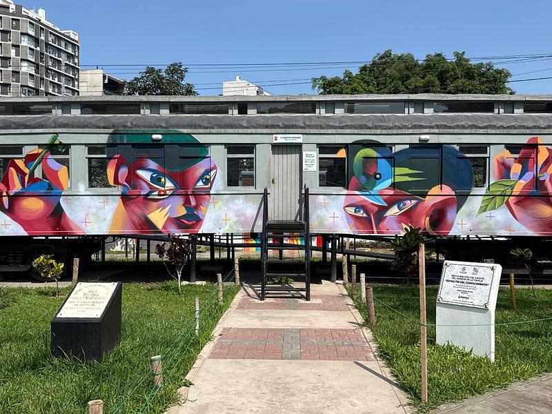 A historic train carriage in Lima, transformed into a vibrant cultural and educational space through urban art.