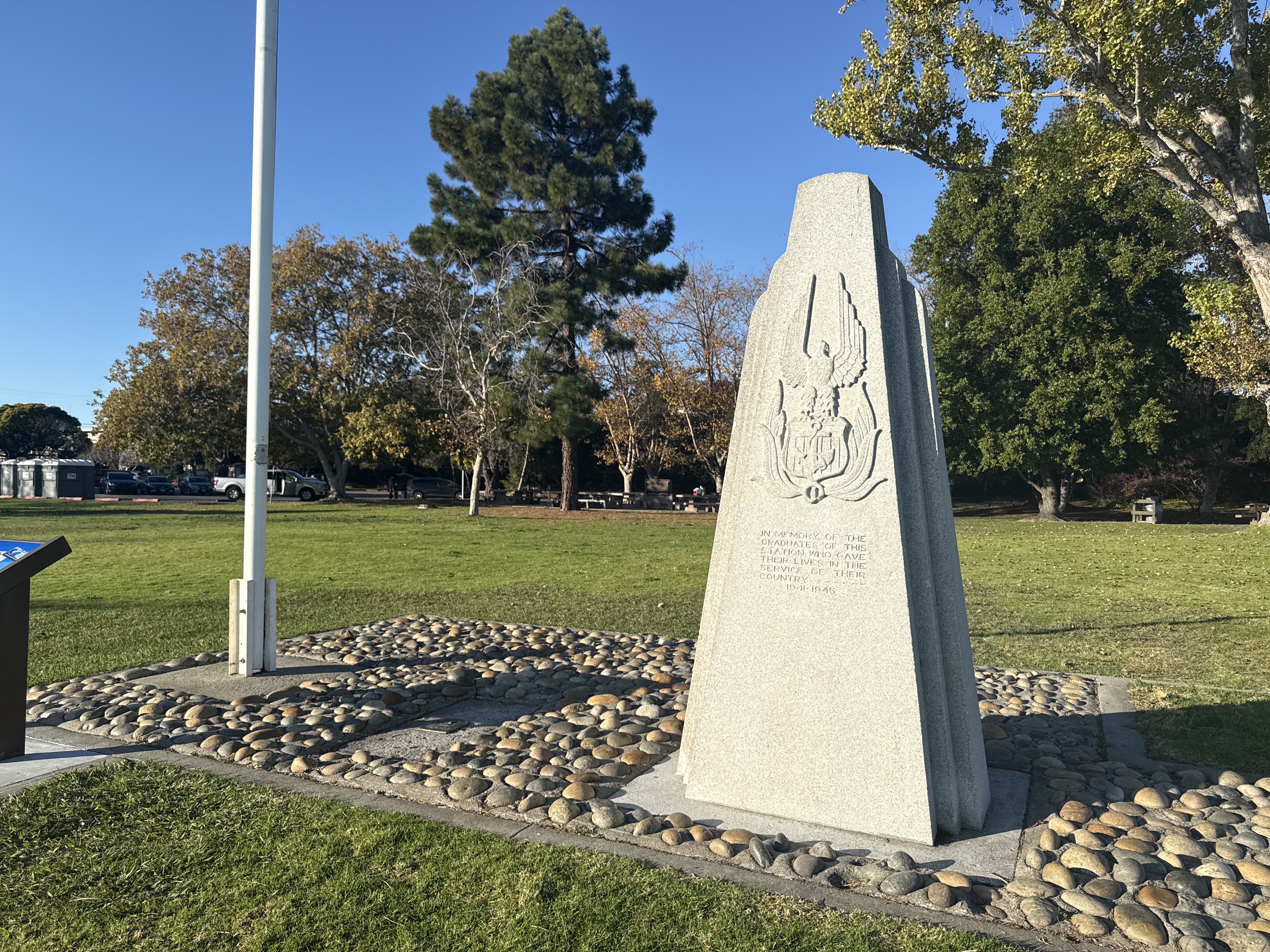 This granite obelisk is the Alameda War Memorial, honoring residents of Alameda, California, who died in service. The carving depicts an eagle above a shield, symbolizing military tribute. The inscription dedicates it "IN MEMORY OF THE RESIDENTS OF THIS SECTION WHO GAVE THEIR LIVES IN THE SERVICE OF THEIR COUNTRY 1941–1945," specifically referencing World War II. Its presence marks this location, Neptune Park, as a space of public remembrance and community history. The memorial is situated in Neptune Park, formerly part of the elaborate Neptune Beach amusement park and resort, often called the "Coney Island of the West," which operated from 1917 to 1939.