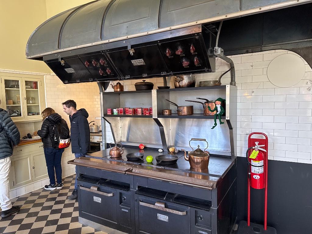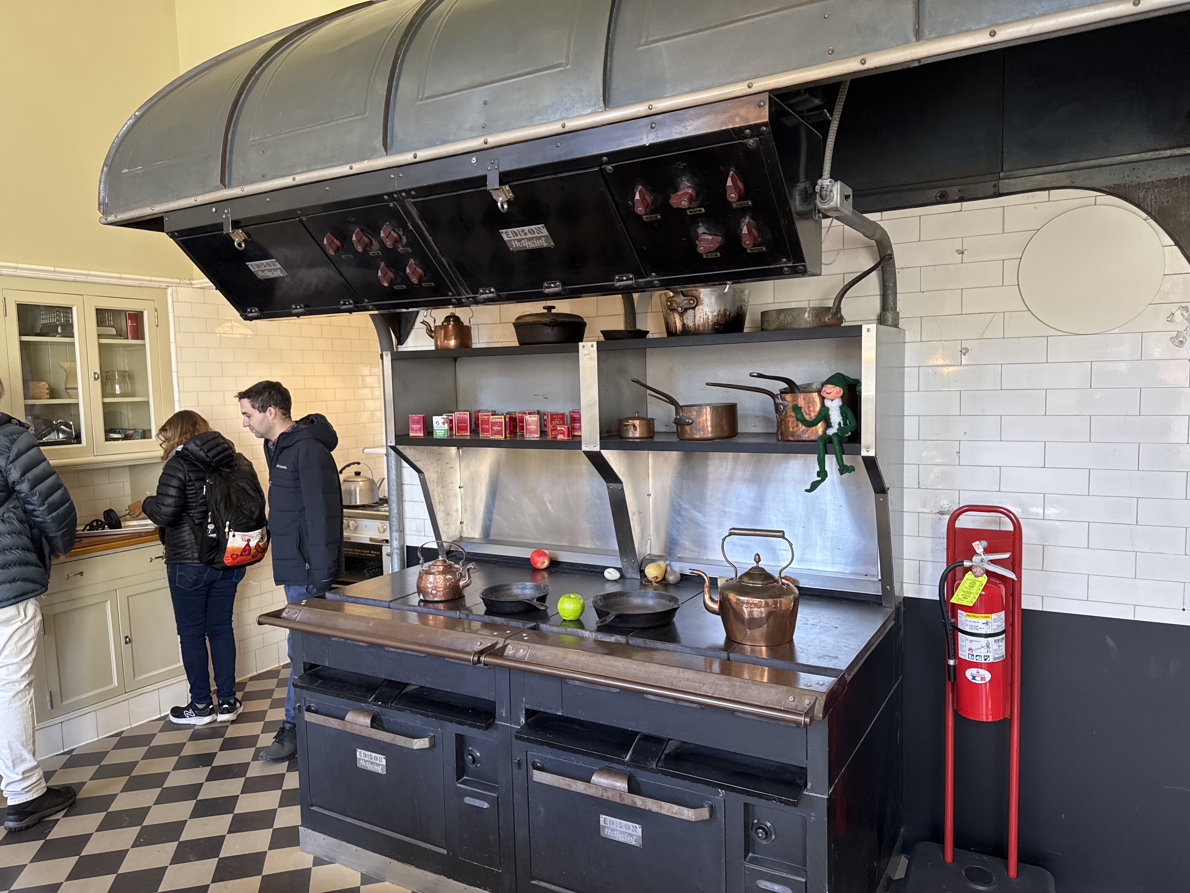 The upper portion with its various knobs and controls, situated above the actual cooking surface and integrated into the exhaust hood, suggests a centralized control system that was advanced for the era. The various copper pots and pans, along with the kettle, evoke a sense of a bustling, well-used kitchen. And a quirky, perhaps an "Elf on the Shelf" type figure, perched on the shelf, adds a touch of modern whimsy to this historical scene.