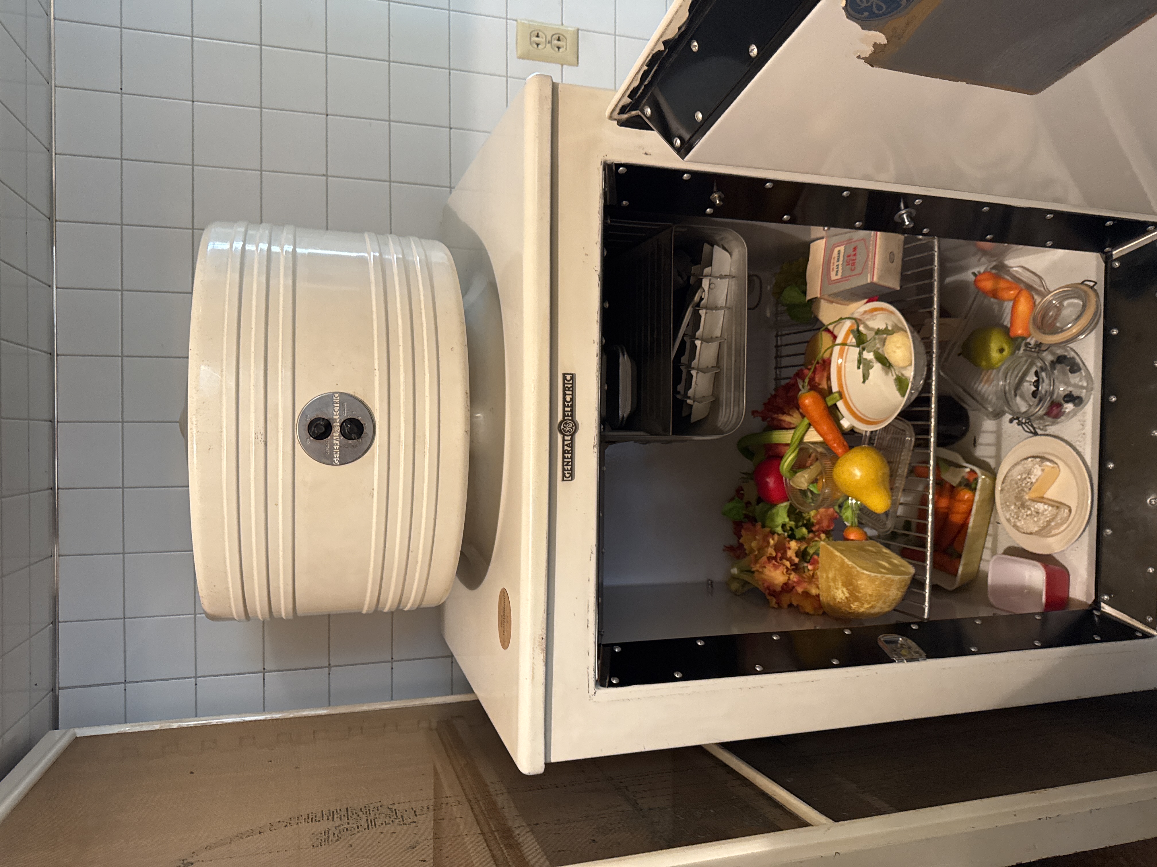 Unlike modern refrigerators, the Monitor Top's cooling system—which used sulfur dioxide as a refrigerant (toxic, if leaked)—was sealed on top because it was impossible to make the unit compact and quiet enough to fit underneath. These were highly efficient for their time, very expensive, and marked a major shift from iceboxes to automated electric cooling in American homes. The food inside appears to be a playful historical display, showcasing produce, cheese, and sometimes-refrigerated items common to the era.