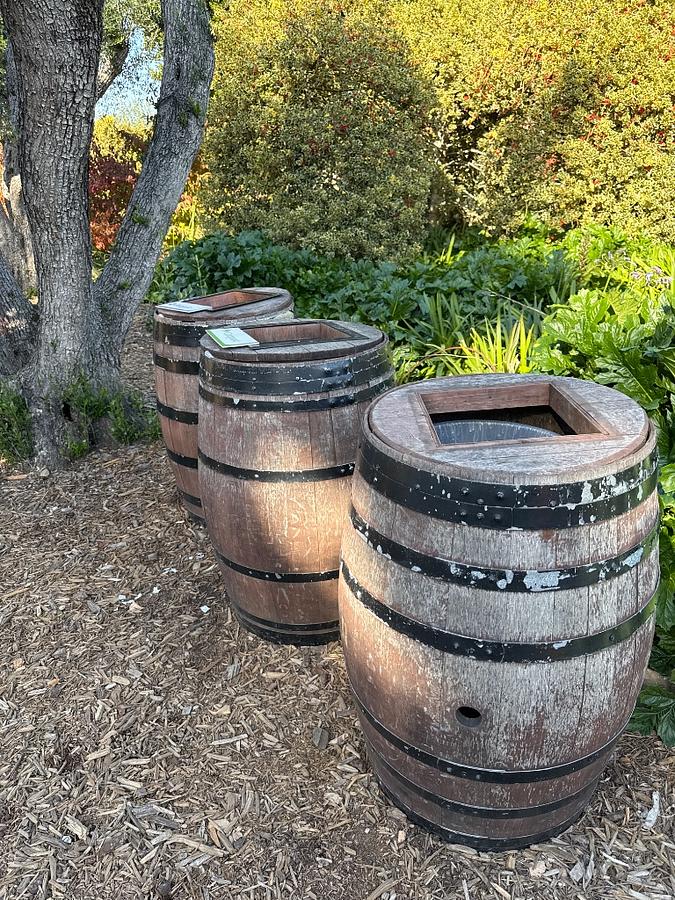 You've spotted some repurposed wine barrels, a clever and quite common sight in California, especially in areas with a rich wine-making history. These aren't just any old barrels, though. They've been given a new life, likely as unique and rustic-style trash receptacles or planters, blending utility with a touch of local character.