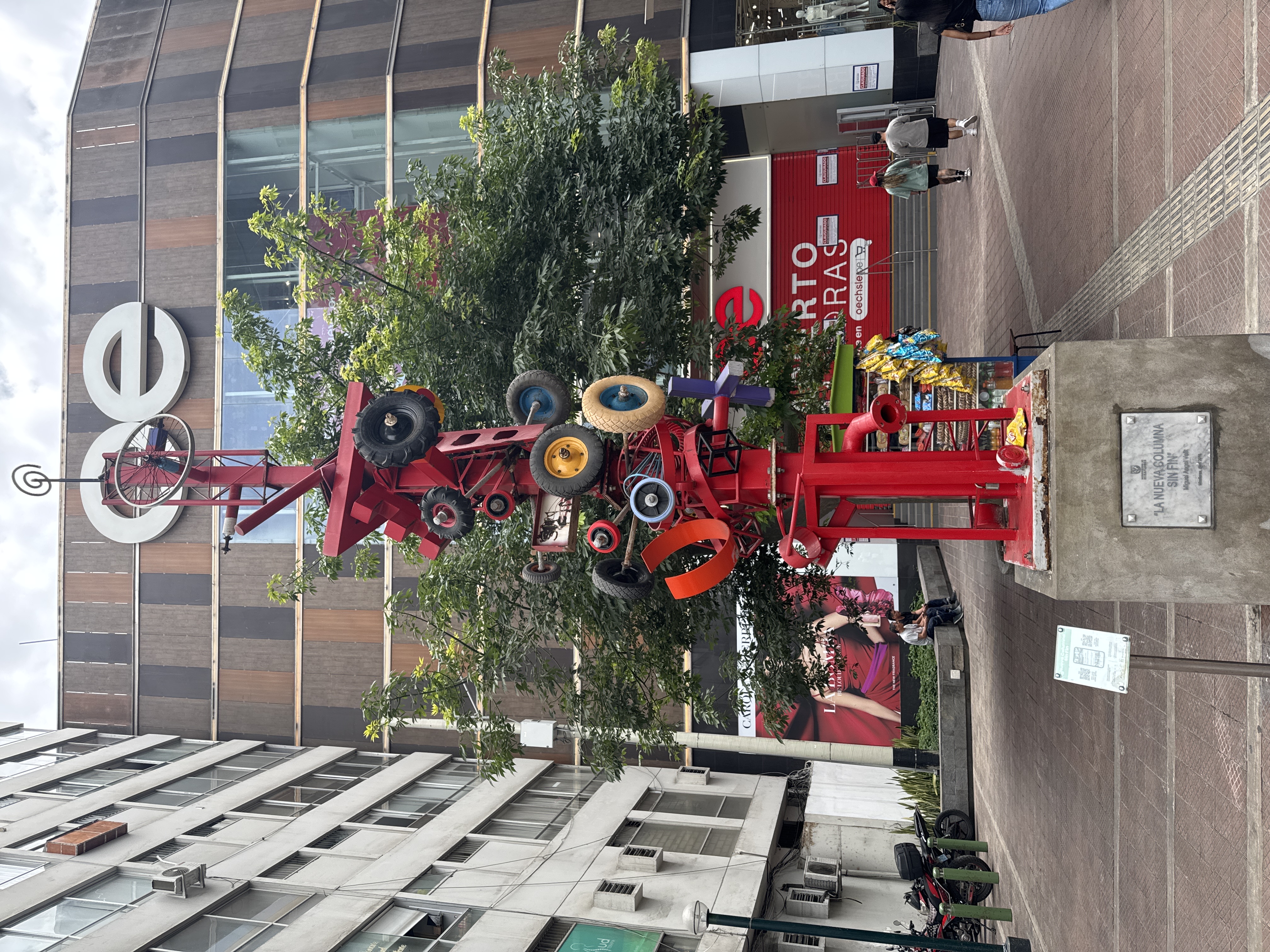 It’s an assemblage art piece, constructed using recycled industrial materials, primarily wheels and metal scrap, painted a vibrant red. The work nods to the famous "Endless Column" by Romanian sculptor Constantin Brâncuși, a modernist masterpiece, but Velezmoro reinterprets the idea using objects characteristic of modern machinery and consumption.
