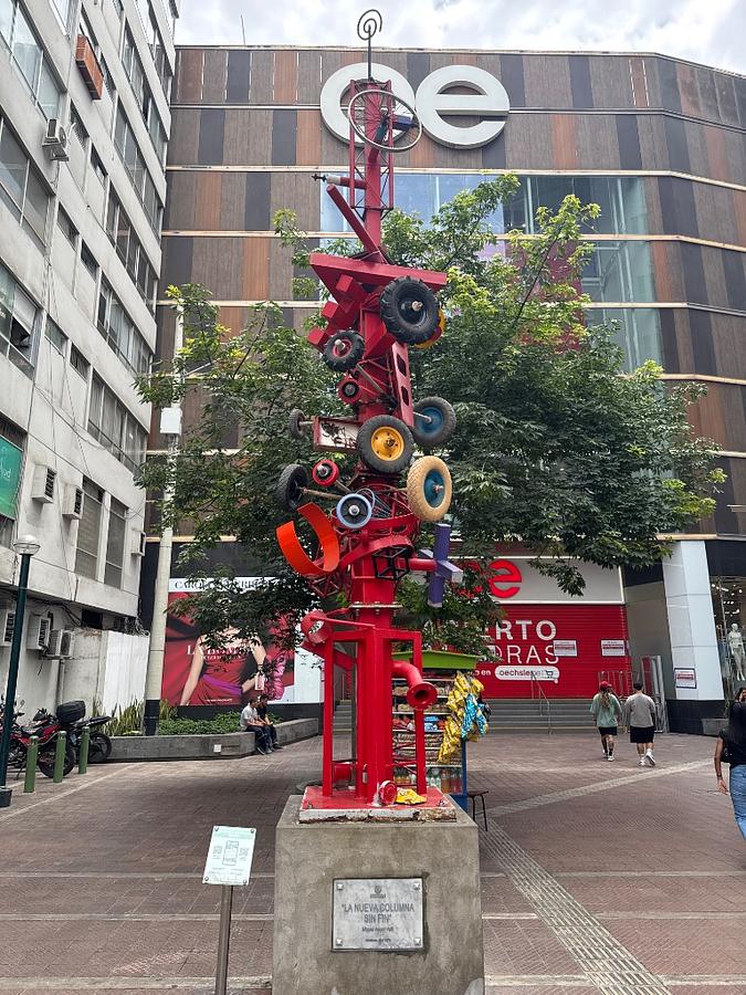 This striking red sculpture, dominating the streetscape, is titled "La Nueva Columna 'Sin Fin'," which translates to "The New Column 'Without End' " or "The Endless Column." It's a creation by Peruvian artist Miguel Baca Rossi, dating back to 1979. What makes it particularly intriguing is the way it incorporates various industrial elements, especially the numerous wheels and gears that seem to be stacked and integrated into its design. This kind of abstract, constructivist art is often intended to invite viewers to interpret its meaning, sometimes reflecting on themes of industry, perpetual motion, or the endless cycle of life and progress.