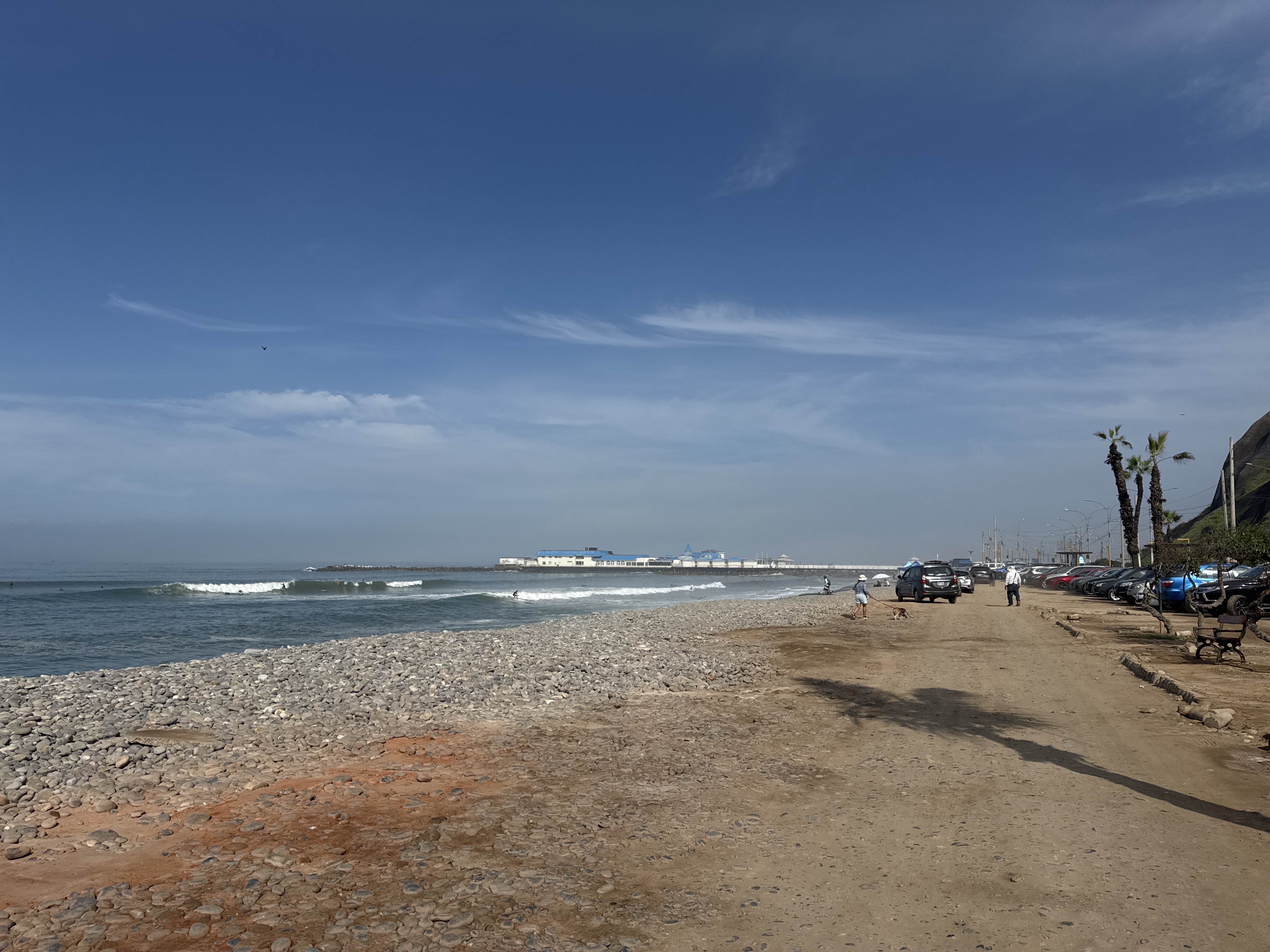 This coastal area is part of Lima's Costa Verde, a unique multi-level urban zone where cliffs meet the Pacific Ocean. Unlike many popular beaches in Europe or North America, Lima's beaches frequently consist of pebbles rather than sand, a result of the city's geological structure and the Pacific's powerful currents. The water in this part of Peru is colder than expected for its latitude due to the Humboldt Current, which brings nutrient-rich, cold water from the Antarctic, making it a haven for marine life but less inviting for casual swimming. Despite this, it's a popular spot for surfing, with waves often breaking against jetties near the shore. The structure further out in the water is likely a pier, possibly part of a yacht club or a fishing pier, common along this stretch of coast.