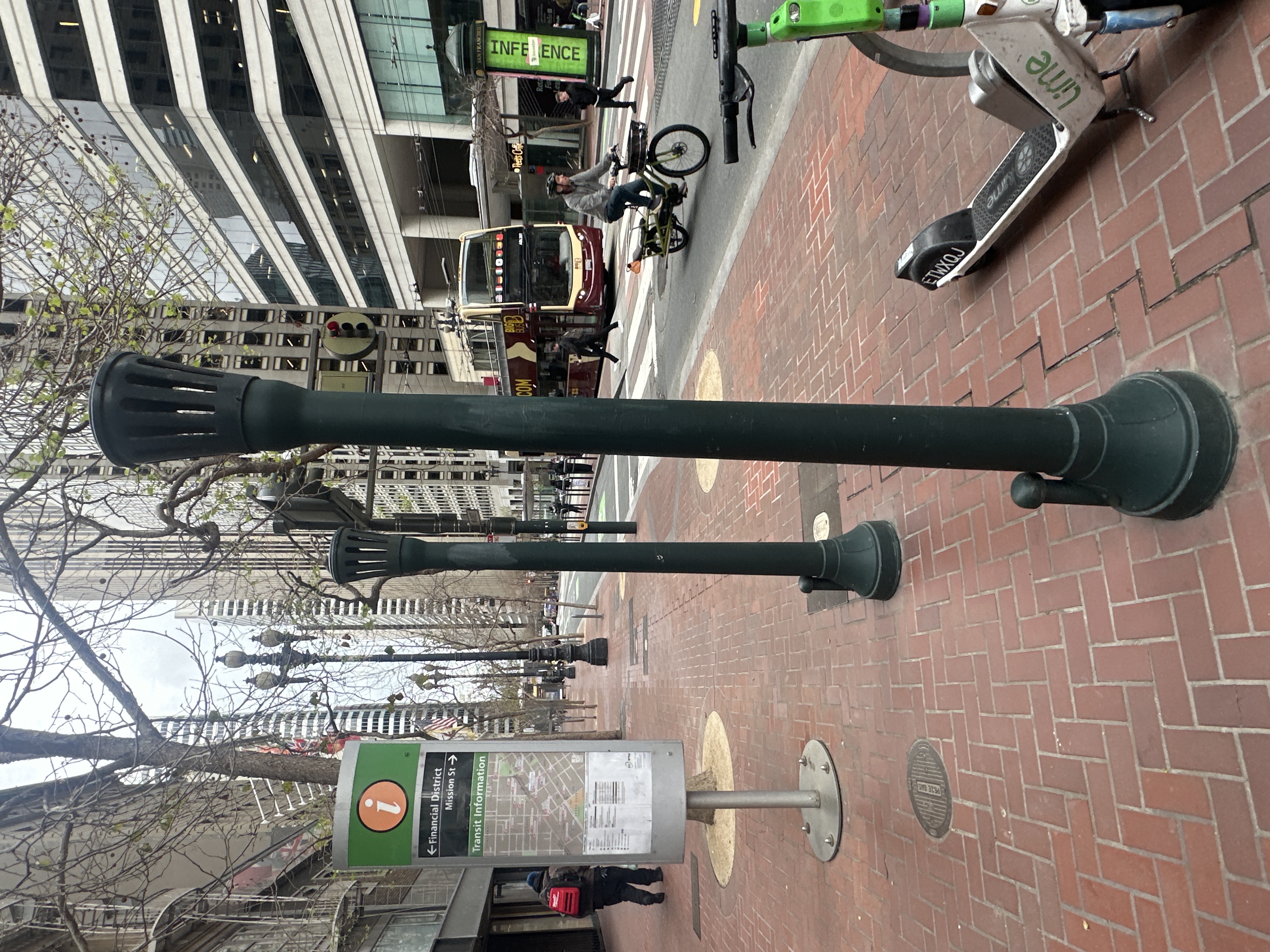 More precisely, these distinctive lamp post-like structures are often subtle exhaust vents for the Bay Area Rapid Transit, or BART, system. Given this location in the Financial District, it's highly likely these are connected to the deep tunnels that carry BART trains beneath the city. As trains move through these subterranean passages, they create considerable air pressure, and these vents allow that pressure to equalize at the surface, preventing uncomfortable air surges for passengers and maintaining air quality in the tunnels. While they may not light up like traditional lamps, their carefully designed tops with slats allow air to flow out effectively.