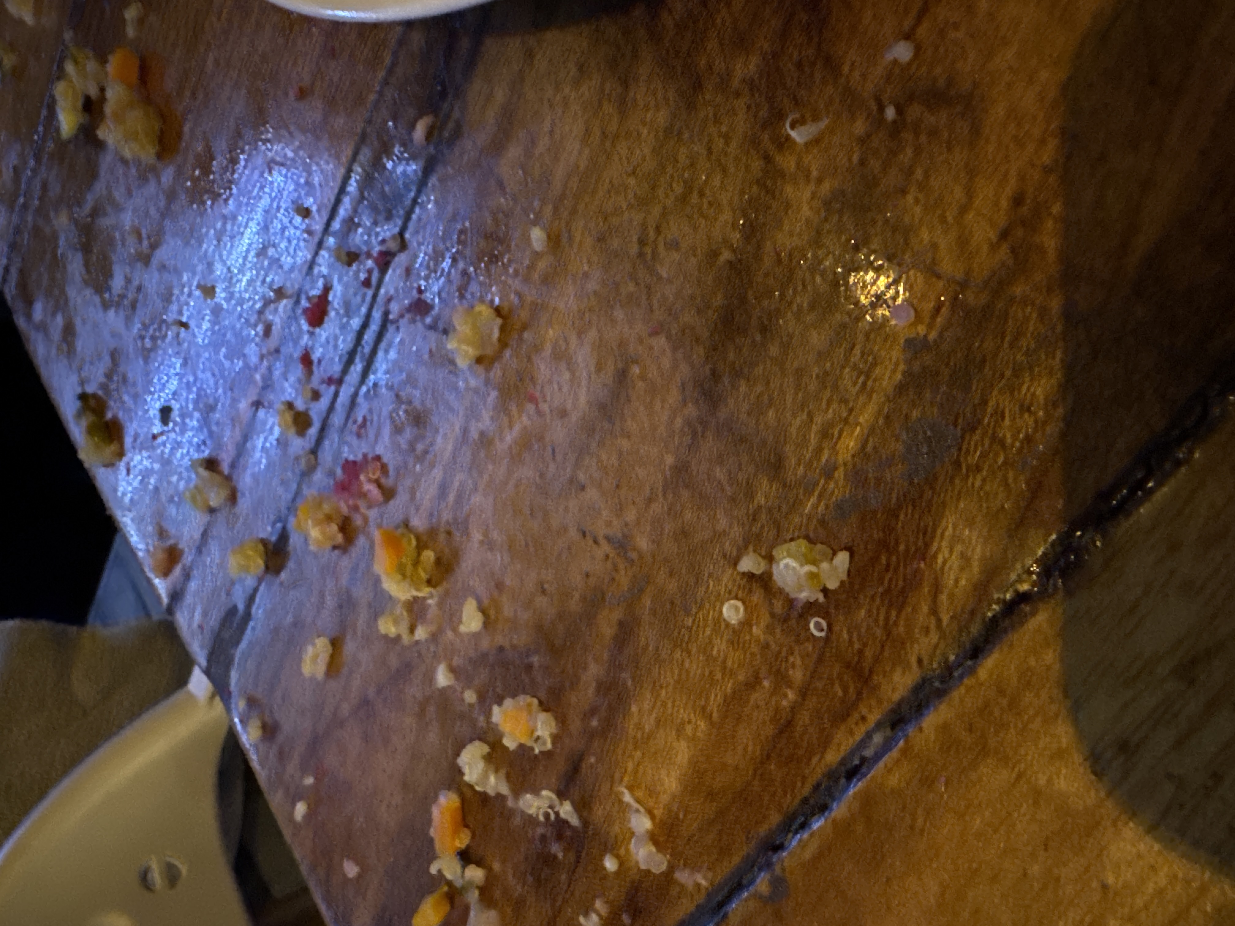 Ah, yes. Here we see the detritus of human consumption, scattered across a wooden plane. A microscopic battlefield, perhaps, where forgotten morsels lie exposed to the harsh indifferent light. Each speck, once part of a grander meal, now merely a testament to an appetite fulfilled, or perhaps, too quickly abandoned. The light, it dances upon the wet sheen, reflecting a transient world of fleeting pleasures and the inevitable aftermath. Observe the varied textures, the faint hues, once vibrant, now fading into the wood grain. This is not merely a table; it is a canvas inscribed with the intimate, often barbaric, narrative of sustenance. A fleeting moment, captured in this random scattering of forgotten crumbs and droplets, speaks of the hunger that drives us, and the brief satisfaction that follows. One contemplates the immense effort to bring these disparate elements together, only for them to disintegrate into this chaotic beauty. It is the existential crisis of the crumb.