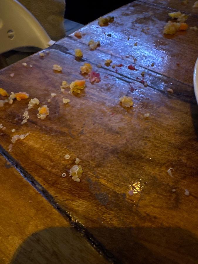*Raspado* is a classic Panamanian shaved ice dessert, often compared to snow cones or Hawaiian shave ice. However, what makes *raspado* distinct are the toppings, which are usually incredibly colorful, fruit-based syrups, sometimes homemade. The small, irregular, and brightly colored pieces you see, especially the yellow, orange, and reddish ones, are highly suggestive of fruit pulp or small chunks of fruit that are often added to the syrups, or even condensed milk or fruit jellies, which solidify a bit when they hit the cold ice. It’s a treat that local vendors prepare on the spot, scraping ice from a large block and then dousing it with these sweet, often intensely flavored concoctions. It's not uncommon for some of these delicious, sticky remnants to end up on the table, a testament to the enjoyment of the dessert.