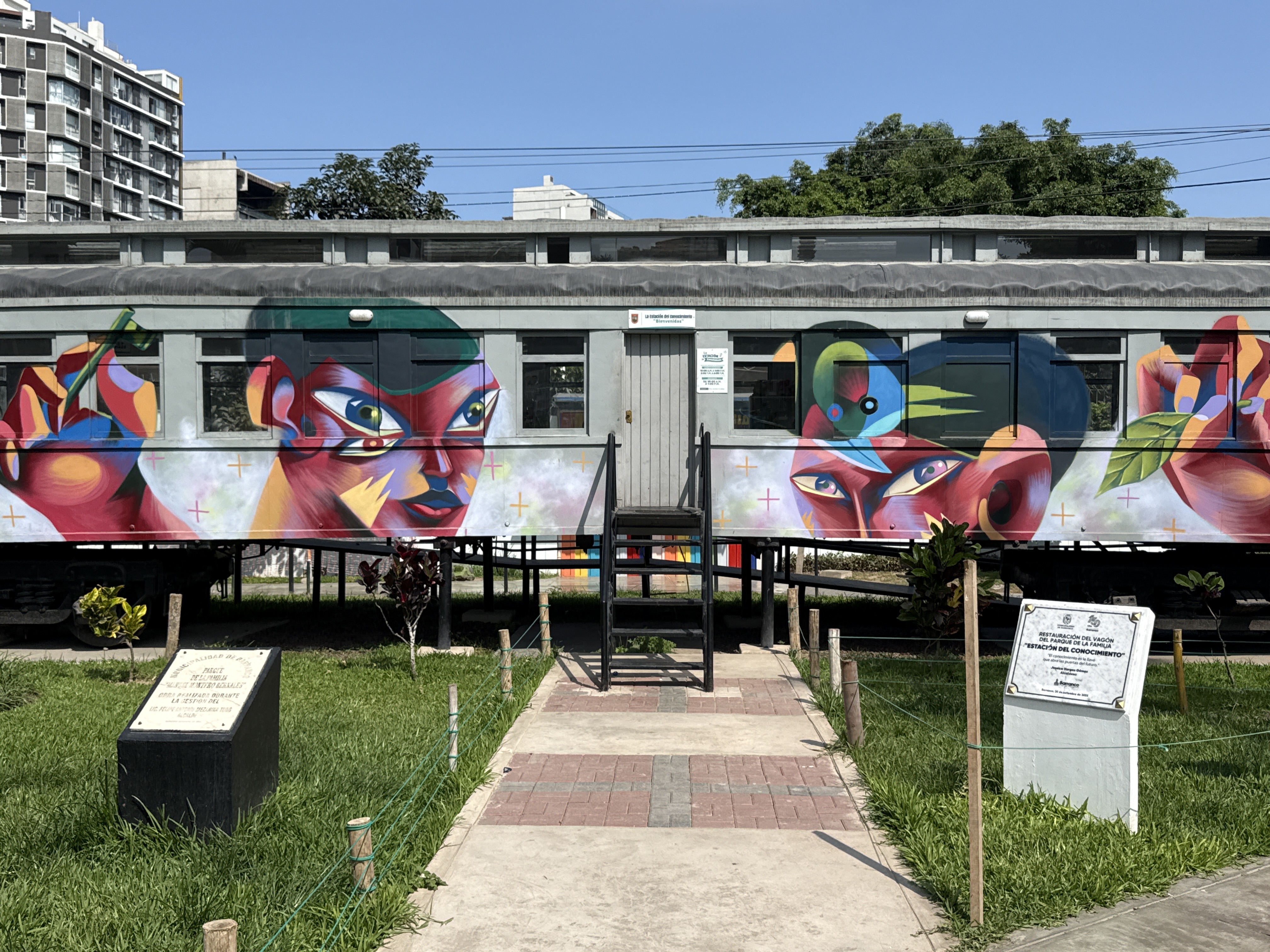 This is a repurposed train carriage, located in Barranco, Lima. Formerly a part of the "Ferrocarril Eléctrico" (Electric Railway), it now serves as a cultural space called "Espacio del Conocimiento" (Knowledge Space). The vibrant mural on its exterior, painted by urban artists, depicts abstract faces and hands, symbolizing knowledge and community. This particular carriage was part of a line connecting Lima to Callao and Chorrillos, operating in the early 20th century. Barranco, known for its bohemian atmosphere and street art, often integrates such historical elements into its contemporary urban landscape. This adaptive reuse highlights the area's commitment to art and educational initiatives.
