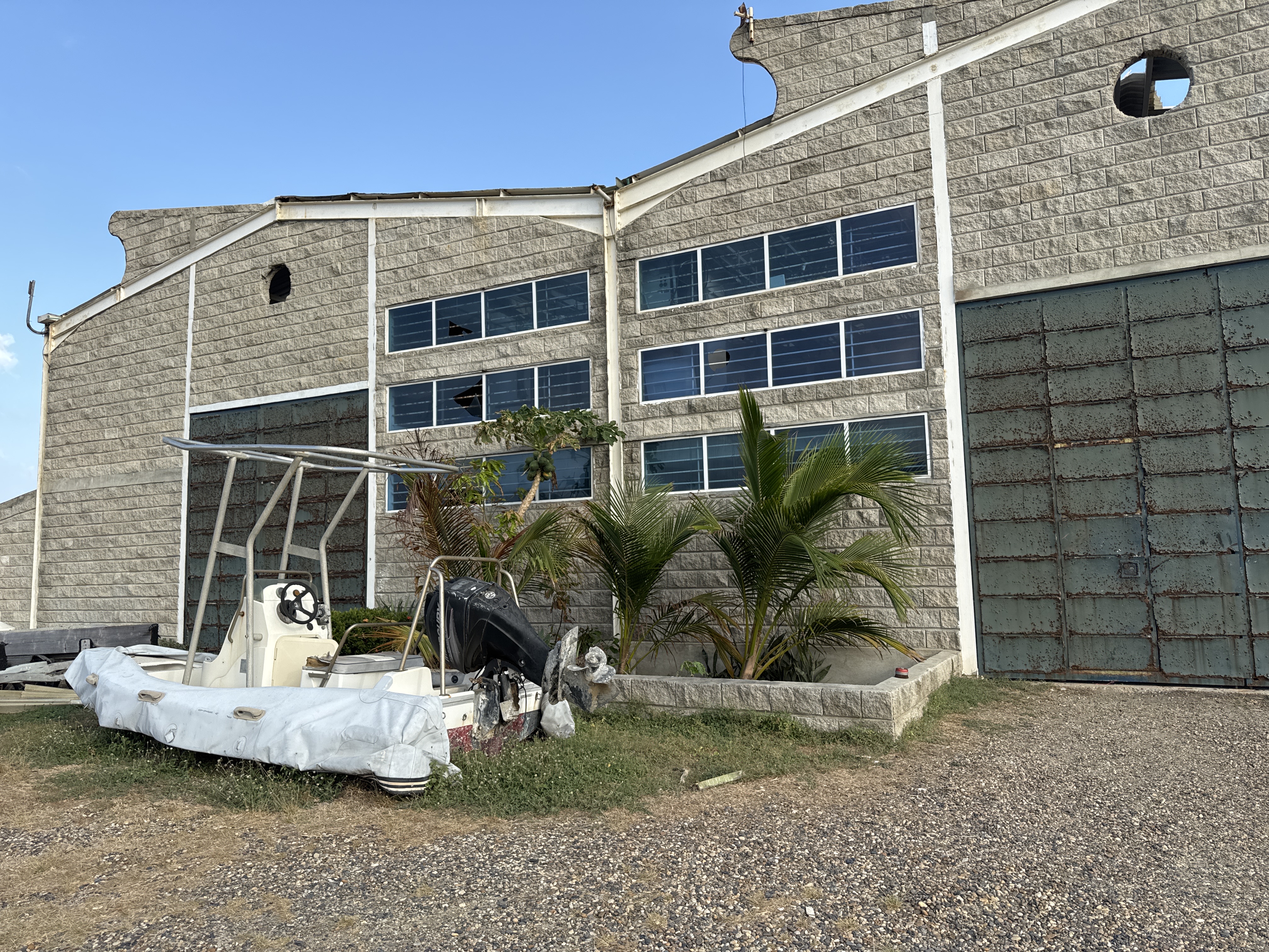 The architecture, with its sturdy block construction and large, somewhat utilitarian windows, suggests a building designed for functionality rather than grand aesthetics. The large, weathered metal doors on the right are characteristic of boat storage or repair facilities, allowing for the movement of vessels in and out of the building. Nestled in front, you can see a boat that appears to be resting on land, perhaps awaiting repair or preparation for the next outing. This type of boat, often a center console design with an outboard motor, is very popular for fishing and recreational trips in the warm waters of the Caribbean. The vegetation, with the palms thriving in their raised beds, further emphasizes the tropical climate of the region.