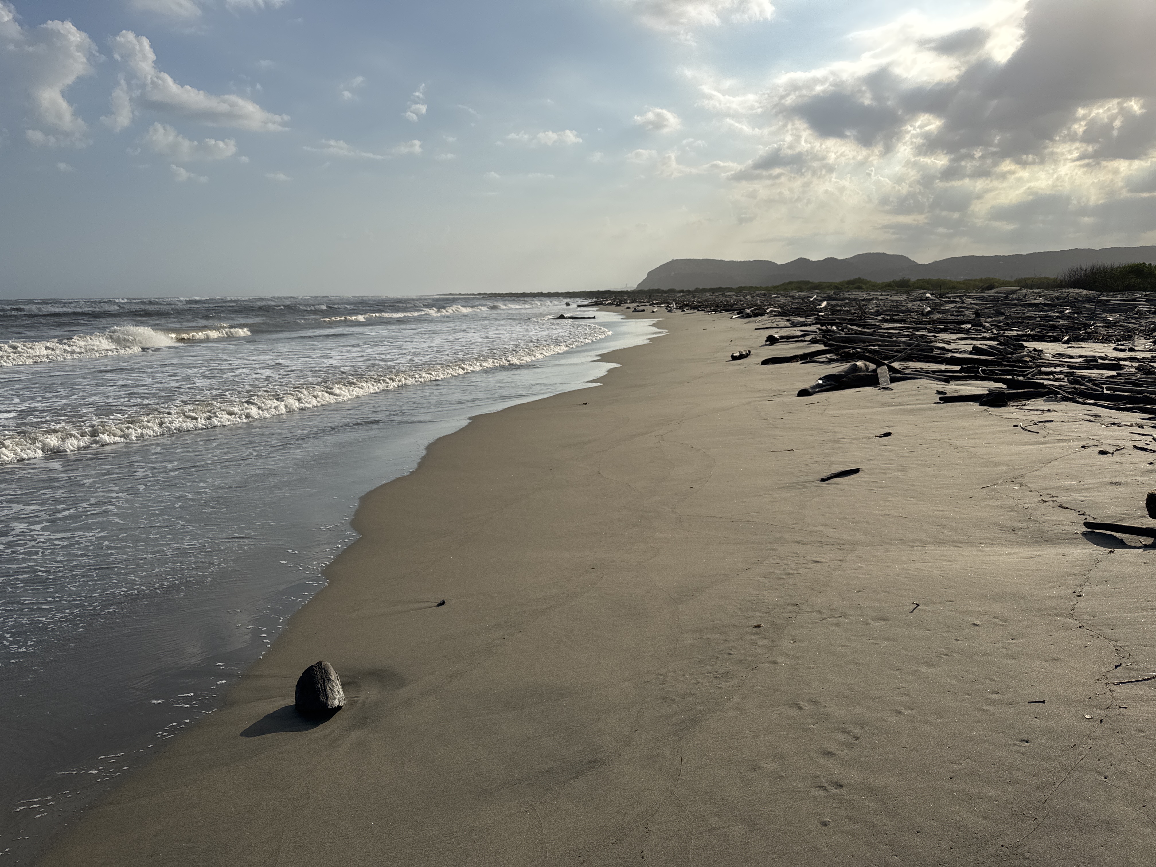 This beach, near Puerto Velero, Colombia, is characterized by its significant deposits of driftwood, a common feature along coastlines where rivers meet the sea. The debris, often from the local Magdalena River, gets carried by currents and deposited here. These types of beaches are sometimes chosen for their wild, untamed beauty, offering a stark contrast to manicured tourist beaches. The waves themselves are typical of a Caribbean Sea coastline, with moderate surf.