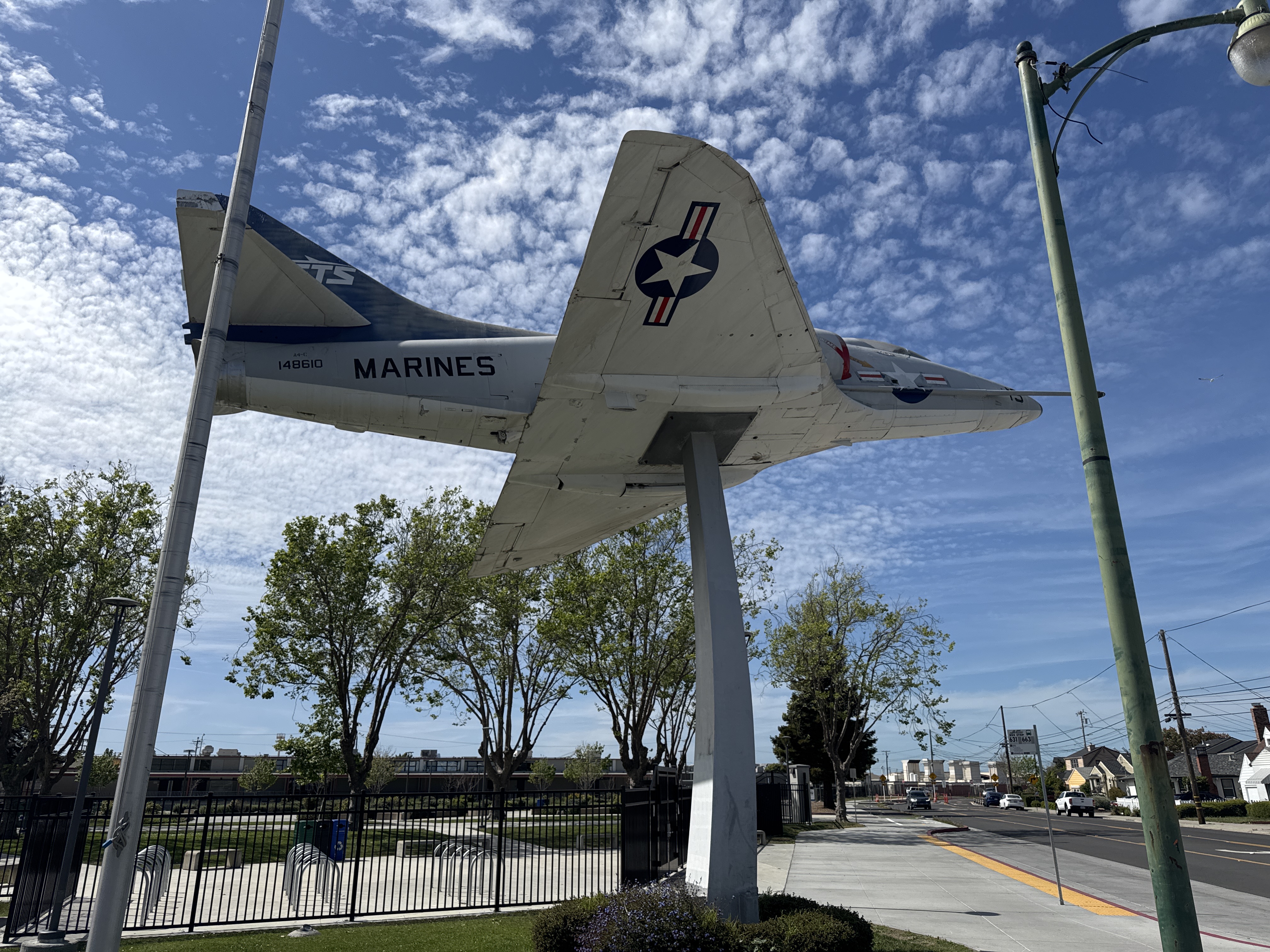 In many American towns, you might see a bronze statue or a plaque, but in a "Navy town" like Alameda, a four-ton attack jet is considered a perfectly appropriate monument to the history of the "Island City."