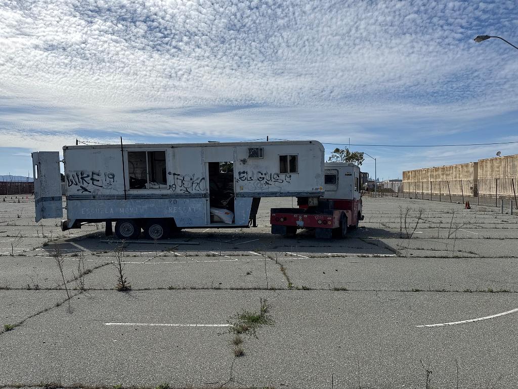 The trailer features the Spanish text **"Escuela Movil"** (Mobile School), suggesting it was once repurposed as a mobile classroom or community outreach unit before being abandoned here. Its current state—vandalized with graffiti—reflects the complex transition of the Alameda Point area, which struggles between high-end redevelopment and its identity as an industrial wasteland favored by urban explorers and street artists. The location is also adjacent to the Alameda Point "Enterprise Zone," where the lack of active surveillance allows such relics to remain for years as unintended monuments to urban decay.